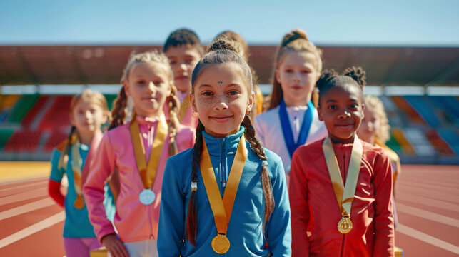 Olympiad Gold Medal Winners, Group of Kids in a Row Standing on the Podium Celebrating Their Success
