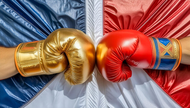 France Paris 2024 Summer Olympic Games Boxing Competitions. Hands wearing red and gold boxing gloves standing opposite each other in front of the French flag.