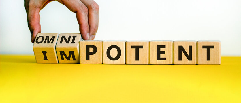 Hand is turning cubes and changes the word 'impotent' to 'omnipotent' or vice versa. Beautiful yellow table, white background. Medical concept. Copy space.