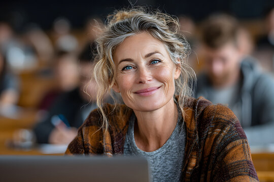 Smiling middle-aged woman studying online on laptop omputer while sitting in cassroom, doing second degre as mature student. Happy45s female attending onlin professional development ourse