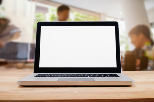 Computer with blank screen on table with blur background. Technology concept.