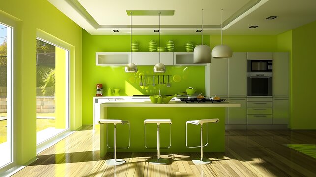 modern kitchen island with three high chairs omputer generated image of a simple kitchen design with green wall