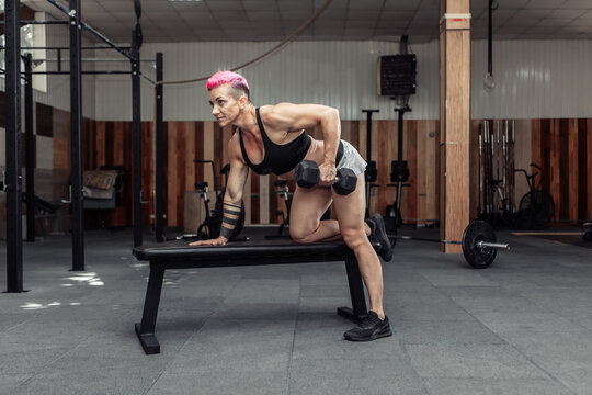 Athletic woman doing dumbbell row exercise with one hand. Back muscle training. Bodybuilding and Fitness