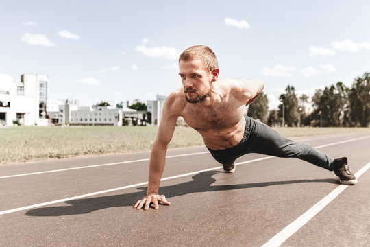 Muscular man doing push-ups on one hand outdoors