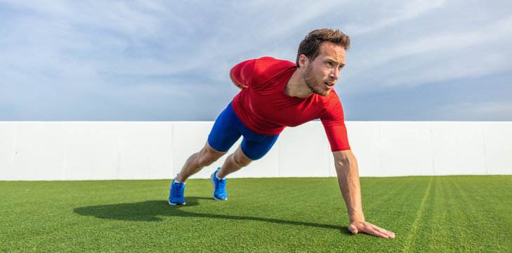 Diverse male athletes doing outdoor push-ups wearing fitness gear