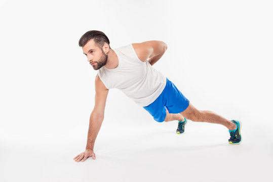 Half turned fullbody portrait of concentrated, confident, sporty, attractive, professional, successful man showing push up on one arm, having hand behind the back, isolated on white background