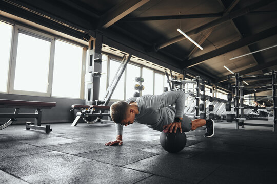 Fitness man doing push up exercise with one hand on medicine ball during intense fitness workout in modern gym