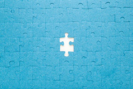 Top view flat lay of jigsaw puzzle with one piece missing .Concept of absence and incomplete.Putting the last piece finding solution