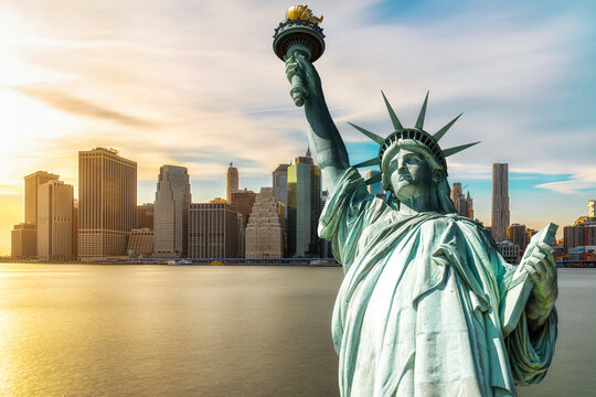 The Statue of Liberty over the Scene of New york cityscape river side which location is lower manhattan at the sunset time, Architecture and building with tourist concept