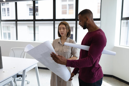Midsection of diverse male and female colleague looking at blueprints and discussing