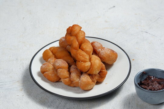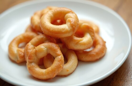Golden brown twisted doughnuts stacked on white plate. Fried pastries traditional Korean sweet snack known as Wang kkwabaegi. Unique ring shape, soft texture, perfect for quick bite dessert.