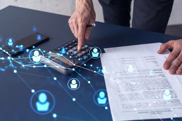 Masked coworkers collaborating at computer with hud data overlay and analytics