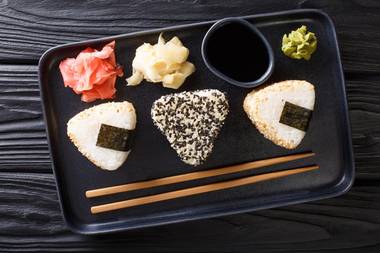 Japanese onigiri served with ginger, wasabi and sauce close-up on a plate. Horizontal top view