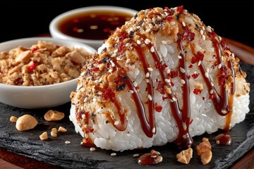 Exquisite detail of gourmet onigiri highlighted by umami sauce and spices served with crushed peanuts and dipping sauce creating a culinary masterpiece ready for tasting