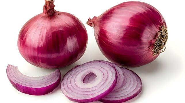 Red whole and sliced onion isolated on white