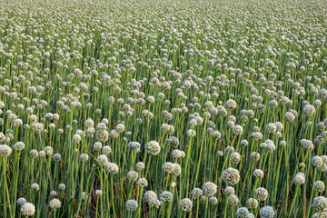 An agricultural field with fully bloomed white onion flower