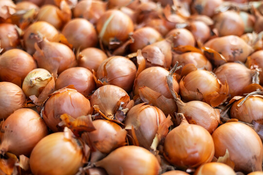 Freshly Harvested Golden Onions in Field Organic Farming Agriculture Close Up