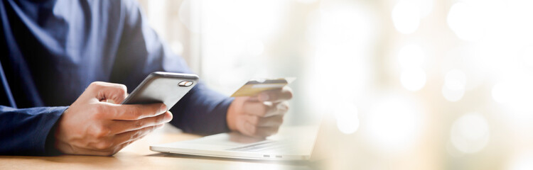 Man holding credit card and using smartphone at home online shopping ecommerce internet banking spend money work from home concept.