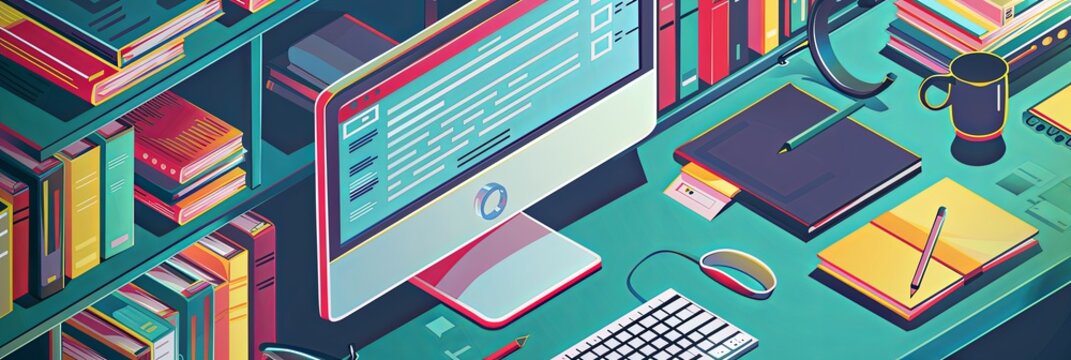 A computer desk is neatly arranged with a keyboard, mouse, and books. This setup suggests someone engaged in online education or professional development. Generative AI