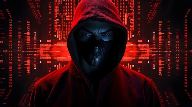 Hooded hacker engaging in cyber activity against digital code backdrop