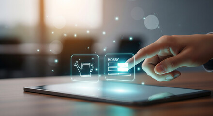 A person's hand selects a glowing hobby icon on a futuristic tablet interface, representing online learning and personal development