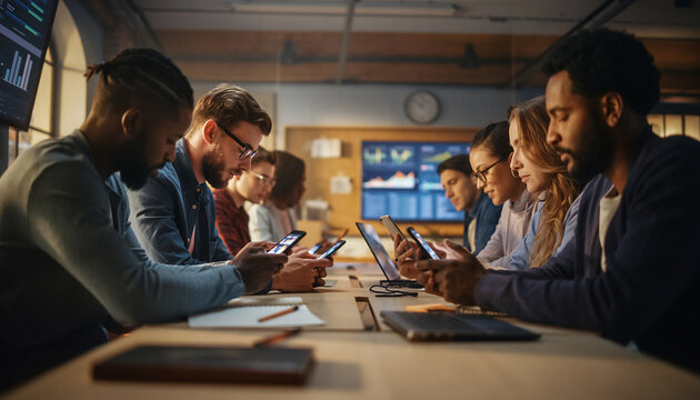 Diverse Team Working in Modern Office Professionals Using Smartphones and Laptops, Collaborating on Project with Technology, Data Analysis and Business Strategy