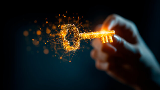 Person holds glowing golden key near digital network graphic. Symbolizes data security access control privacy ownership concept. Future tech innovation solution