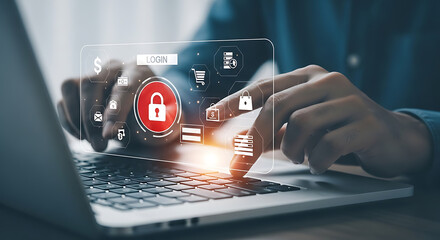 Man interacting with virtual cybersecurity interface showing red padlocks and digital ID cards on futuristic transparent display over laptop in dark room.
