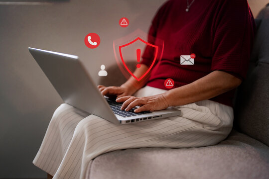 Scam alert, software warning fraud, cyber security. Hacker detection cyber attack on computer network, virus, spyware, malware, malicious software and cybercrime, online website. Protect information
