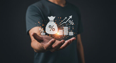 Growth on Hand: Boost Your Investments & Maximize Returns! Percentage, Money Bag, & Coin Stack Icons Representing Success.