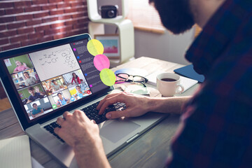 Caucasian man using laptop for video call, with diverse elementary school pupils on screen