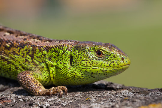 Reptile shot close-up.Nimble green lizard ( Lacerta viridis, Lacerta agilis ) closeup, basking ontree under the sun.Male lizard in mating season on a tree covered with moss and lichen.The sand lizard