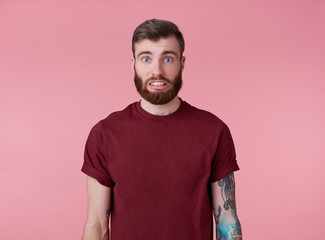 Ooops! Something wrong! Portrait of young attractive tattooed red bearded man in blank t-shirt, looks sorry and sad, stands over pink background.