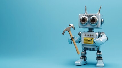 404 error page not found. Serviceman robot with hammer and pliers on blue background. Text message Something went wrong but we are working on it.
