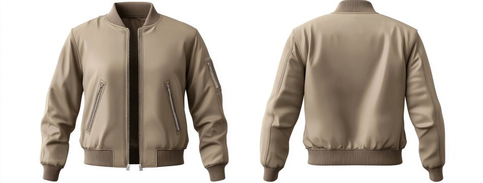 A sleek bomber jacket mockup with zippers on the sleeves, front and back view isolated on a white background