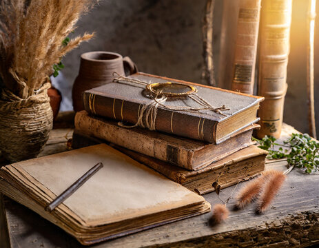 Rustic still life with antique books. Earthy tones, vintage details. Stack of antique books with a weathered notebook. Warm lighting highlights the nostalgic charm of the rustic setup.