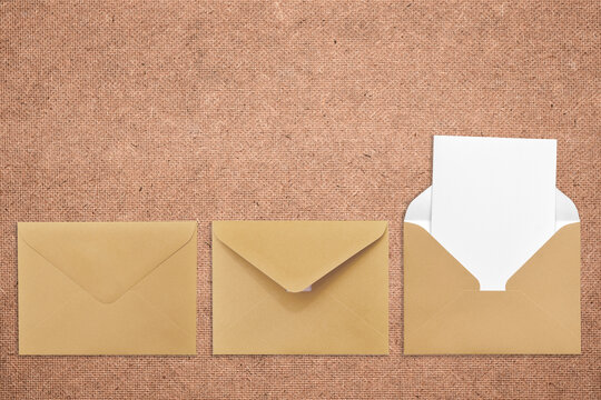 Three craft envelopes on textile background one open with a note inside. Place for your text. Delivery service.