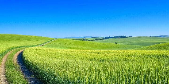 Vibrant green winter wheat fields stretch across the landscape under a sunny spring day, complementing the clear blue sky above and the scenic highway winding through the wheat fields.
