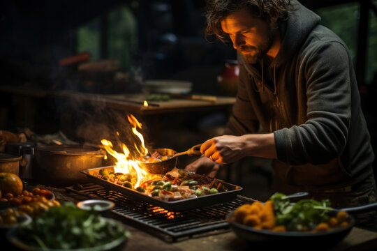 A camper prepares a meal over an open flame, mastering the art of outdoor cooking during a camping experience. Generative Ai.