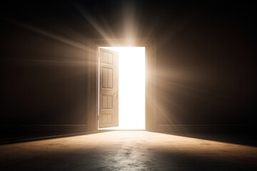 Open golden gates to heaven with bright light. 3D rendered heavenly gate to realm of tranquility. Shimmering light around golden gate. Digital art panorama background of paradise. Concept of hope,