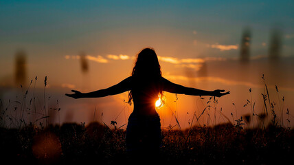 silhouette of woman open arms under the sunset
