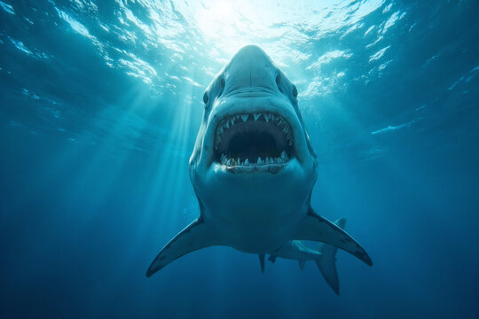 A great white shark swims to the surface from out of the depths of the deep blue ocean, spotting a victim in the sea waters, its jaws with sharp teeth are wide open, about to attack and eat its prey.