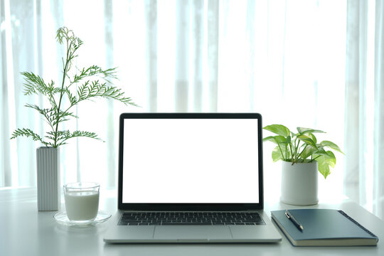 Laptop on table with coffee, plant, and notebook in a bright, modern workspace