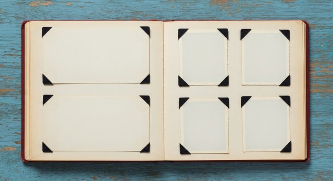 Open Vintage Photo Album on Teal Wood Blank Pages Awaiting Memories.