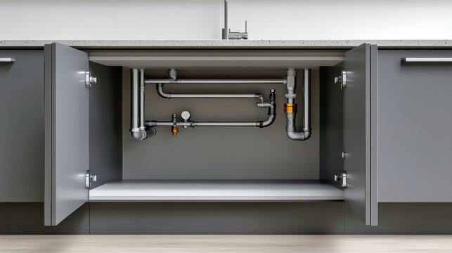 This vibrant kitchen showcases a modern sink with an open cabinet revealing exquisite plumbing details, emphasizing sleek lines and a stylish gray palette