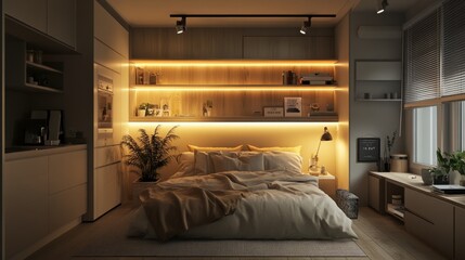 A compact studio apartment with cozy seating, soft lighting, and neutral-toned furnishings creating a warm atmosphere.