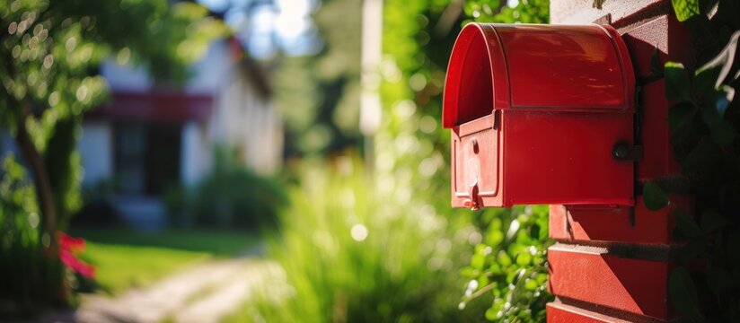 Close up red mail box on front yard of house