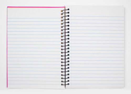 Open coil notebook with blank lined paper pages over a white background. Copy space.