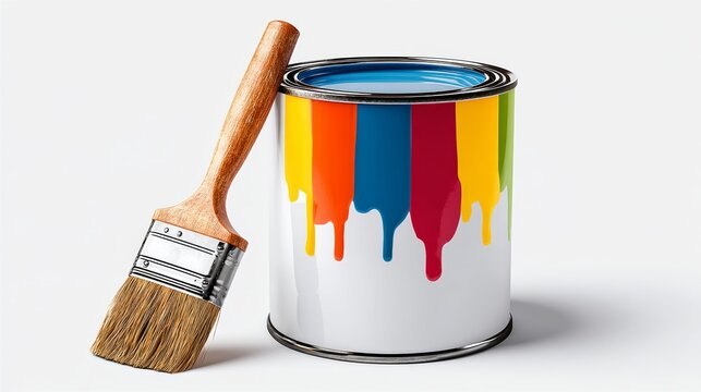 Can of paint with a brush next to it. The paint is in a rainbow of colors
