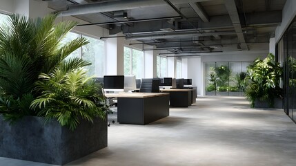 Professional woman working on laptop in modern open-plan office with natural greenery